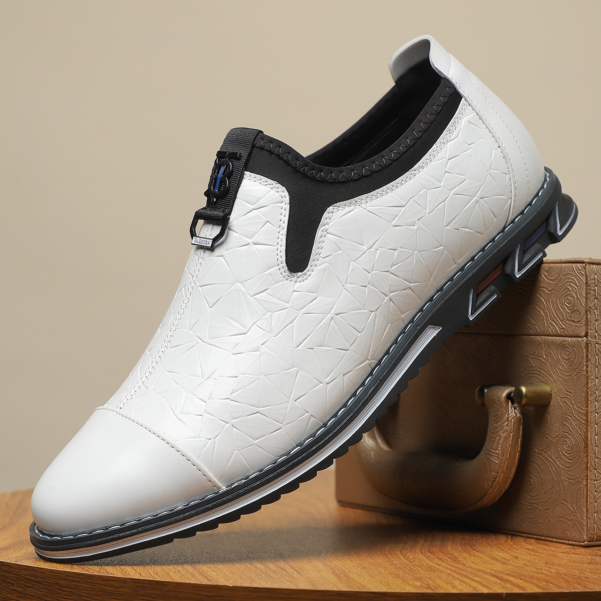 • Embossed leather upper